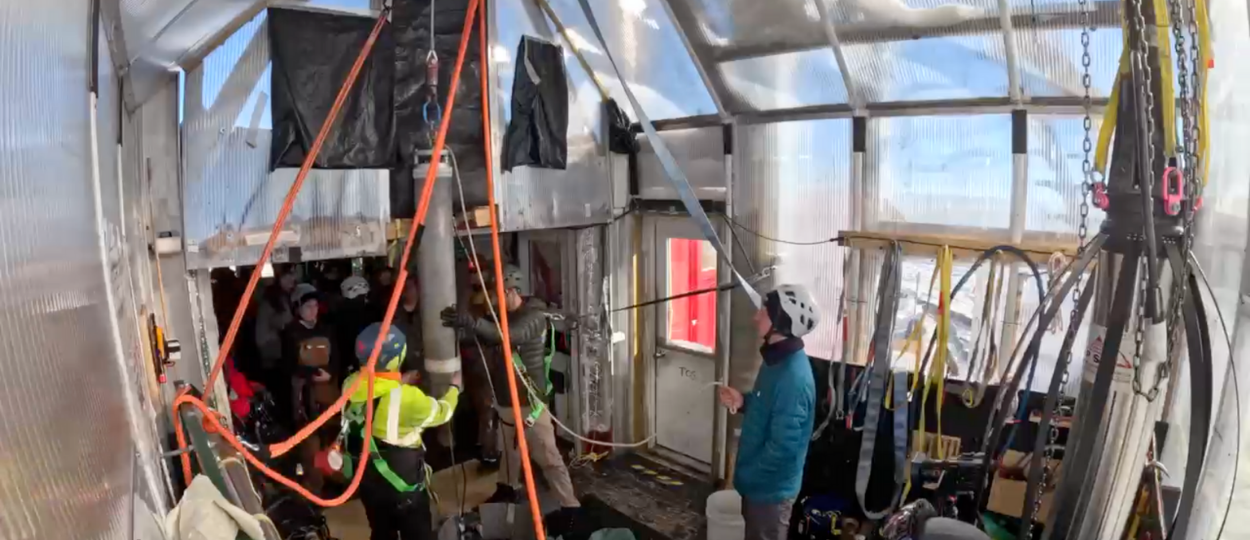 Photo right: Deep Ice Seismometer System being lowered into QSPA station, Antarctica. Courtesy of Skyler Grulke, IceCube Neutrino Observatory, NSF.